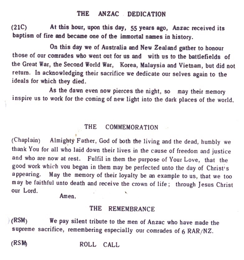 webmaster [21 April 2012] ANZAC Day 1970 - This ANZAC dedication is from the actual programme for the ANZAC Day dawn service held by 6RAR/NZ ANZAC Battalion in NUI DAT lines South Vietnam 42-years ago: about 1000 Australian and New Zealand veterans paraded to remember the 28 6RAR/NZ and support arms officers and men who died during the unit's 2nd tour of duty. click here for the full Nui Dat ANZAC Day 1970 programme