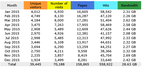 January 2016] In 2015 the W3 website readership peaked with 4749 unique visitors in February, a further significant increase from the previous year high of 3652 in December 2014, before dropping to a December 2015 total of only 1924. The decline might be due to Google changing their search engine algorithm with a bias against websites that are not mobile-friendly [W3vietnam isn't]. The first table illustrates different statistics for visitors: unique visitors is based on different IP addresses [same computer multiple visits equals one] - No of visits is a computer who has not linked to the site in the previous hour - pages is the total of times a HTML [web] page has been viewed [but does not count PDF or other files or images], while hits show total of everything viewed or downloaded [page plus all images on page are counted] and bandwidth is the amount of data downloaded and read each month.