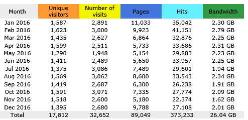 January 2017] In February 2016 the W3 website readership slightly peaked with 1623 unique visitors, with an annual total of 17,812 unique visitors. The first table illustrates different statistics for visitors: unique visitors is based on different IP addresses [same computer multiple visits equals one] - No of visits is a computer who has not linked to the site in the previous hour - pages is the total of times a HTML [web] page has been viewed [but does not count PDF or other files or images], while hits show total of everything viewed or downloaded [page plus all images on page are counted] and bandwidth is the amount of data downloaded and read each month.