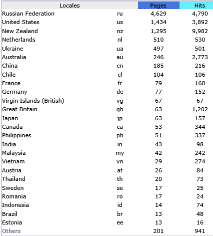 The second table illustrates the wide range of countries finding the website; in the past the US was consistently the largest source of visitors. While New Zealand access is in third place the bandwidth for local hits at 893.35Mb is three time higher that of the US: