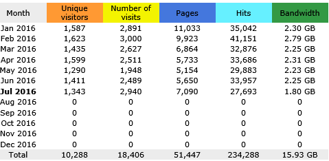 July 2016] The first half of 2016 saw almost 9000 unique visitors to the W3 website, readership peaking in February with 1623 unique visitors dropping to 1290 in May. The average monthly unique readership for the six month period was 1491. 243 visitors in June (10%) remained for over 2-minutes to greater than an hour The first table illustrates different statistics for visitors: unique visitors is based on different IP addresses [same computer multiple visits equals one] - No of visits is a computer who has not linked to the site in the previous hour - pages is the total of times a HTML [web] page has been viewed [but does not count PDF or other files or images], while hits show total of everything viewed or downloaded [page plus all images on page are counted] and bandwidth is the amount of data downloaded and read each month.