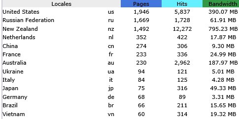 The second table illustrates the wide range of countries finding the website - figures are for July 2016 only; the US is again the largest source of visitors. New Zealand is in the top three. Russia appears to be researching the site: