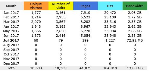 July 2017] March 2017 W3 website readership peaked with 2070 unique visitors, with a six month total of 10,603 unique visitors. Interest in the W3 website is still strong for a website of this genre. The first table illustrates different statistics for visitors: unique visitors is based on different IP addresses [same computer multiple visits equals one] - No of visits is a computer who has not linked to the site in the previous hour - pages is the total of times a HTML [web] page has been viewed [but does not count PDF or other files or images], while hits show total of everything viewed or downloaded [page plus all images on page are counted] and bandwidth is the amount of data downloaded and read each month.